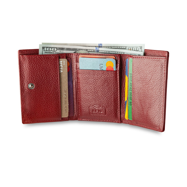 Структура: 7 відділень для кредитних і дисконтних карток, 1 відділення для купюр, відділення на блискавці для монет та інших дрібних предметів. Гаманець закривається на кнопку.