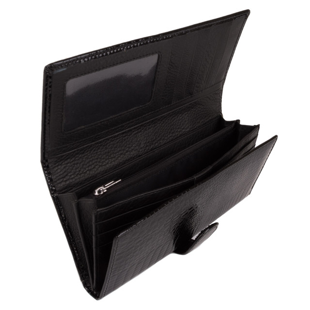 Структура: 14 відділень для кредитних і дисконтних карток, 6 відділень для купюр, відділення на блискавці для монет та інших дрібних предметів. Гаманець закривається на кнопку.